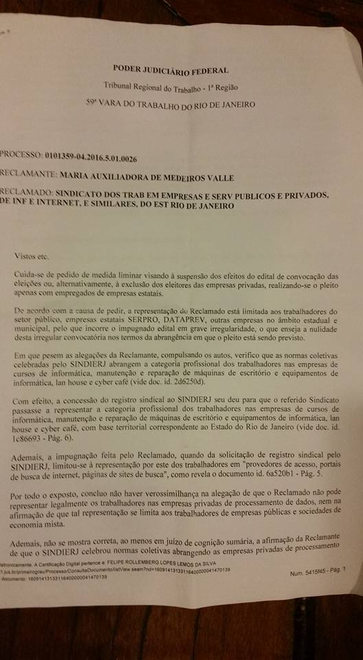 A chapa 2, de oposição à atual diretoria do Sindpd-RJ, ingressou com liminar solicitando à Justiça que fossem desconsiderados os votos dos trabalhadores e trabalhadoras em empresas privadas de Informática do processo de eleição da nova diretoria do Sindpd-RJ. A Justiça negou o pedido, mantendo íntegra a composição da base do Sindicato. Na decisão, o juiz determinou apenas que sindicato “se abstenha de contabilizar, no resultado do certame, votos dos eleitores que sejam trabalhadores nas empresas de cursos de informática, manutenção e reparação de máquinas de escritório e equipamentos de informática, lan house e cyber café”.