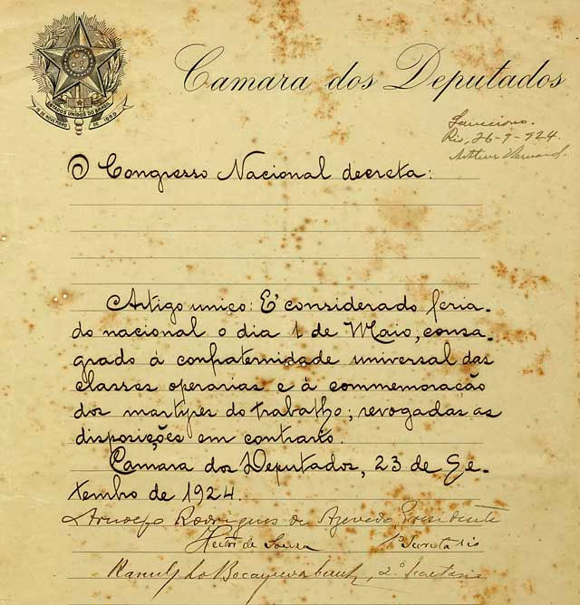 A celebração da data já havia começado a partir de 1890, quando os movimentos de operários originados pela revolução industrial surgiram fazendo com que no início do século 20 nascessem os primeiros sindicatos. Mas, somente em 1924, o então presidente Arthur Bernardes, decretou, oficialmente no país o 1° de maio como Dia Internacional do Trabalhador. (Abaixo o documento original da lei que em 1924 tornou o 1º de maio feriado).